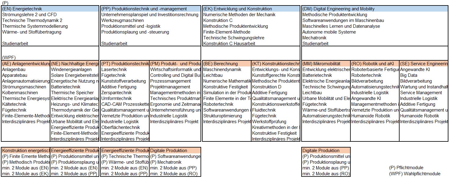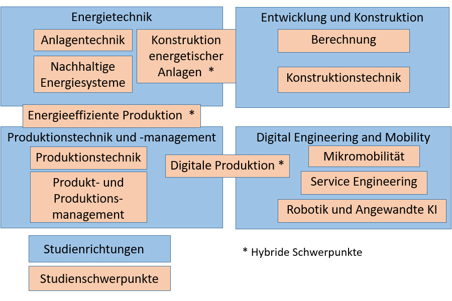 In der Übersicht sind die vier Studenrichtungen blau hinterlegt. Studierende müssen im Studienverlauf eine Studienrichtung wählen. Innerhalb der Studienrichtungen sind Pflichtfächer zu wählen. Ein späterer Wechsel ist möglich, ggfs. müssen neue Pflichtfächer absolviert werden. Innerhalb einer Studienrichtung sind mehrere Studienschwerpunkte wählbar. Die sogenannten hybriden Schwerpunkte (*) sind jeweils zwei Studienrichtungen zugeordnet und bilden somit eine Schnittmenge der beiden Richtungen. Die hybriden Schwerpunkte sind dabei von beiden Studienrichtungen aus wählbar.