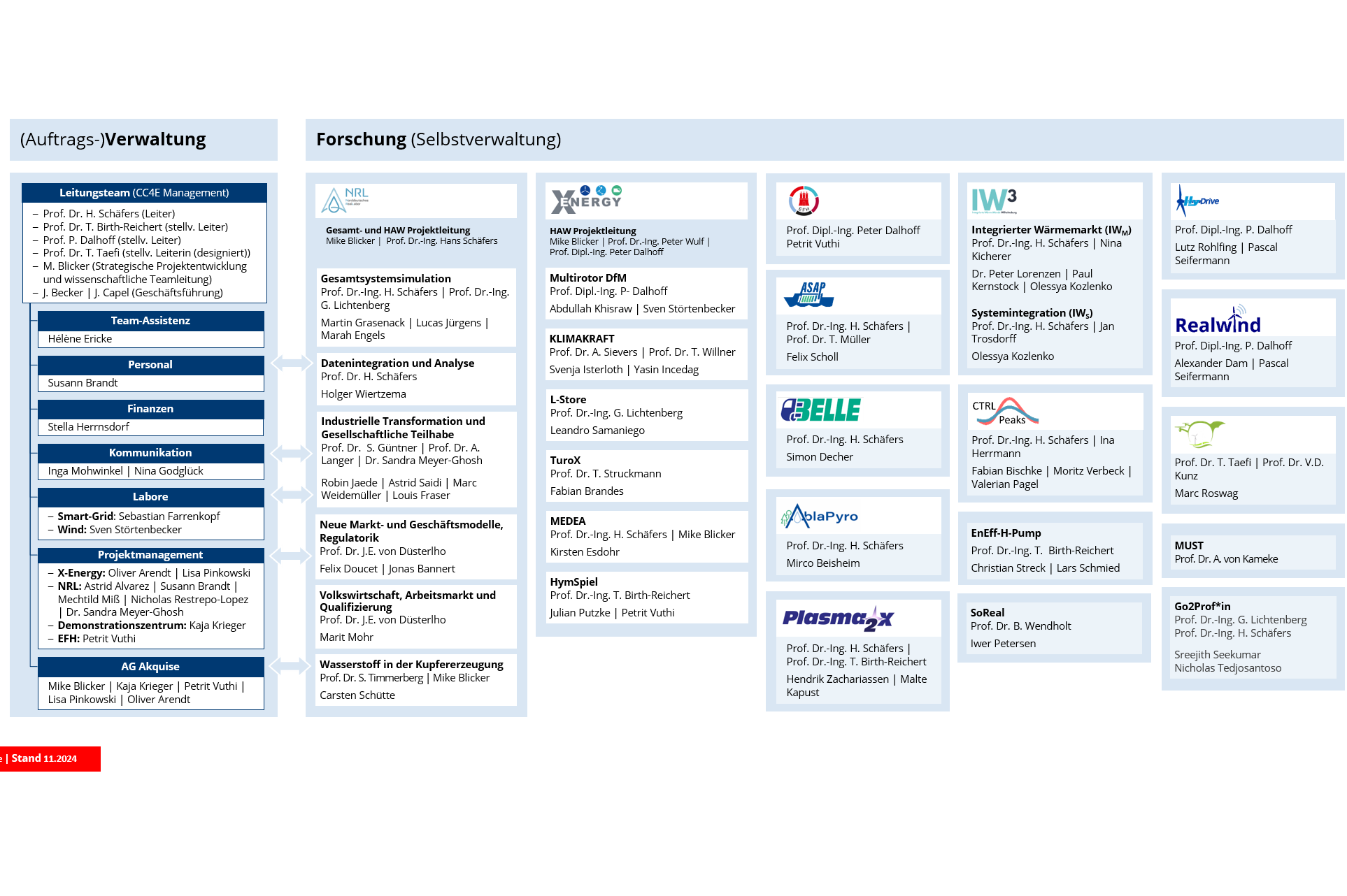Die Organigrammstruktur nach Kompetenzteams zeigt die inhaltlichen Forschungsschwerpunkte in den (Teil-)Projekten und gibt die jeweiligen Ansprechpartner wieder. Die Organigrammstruktur nach Projekten hingegen zeigt insbesondere die Zusammengehörigkeit und Leitungverantwortung in den Verbundprojekten mit ihren jeweiligen Teilprojekten.