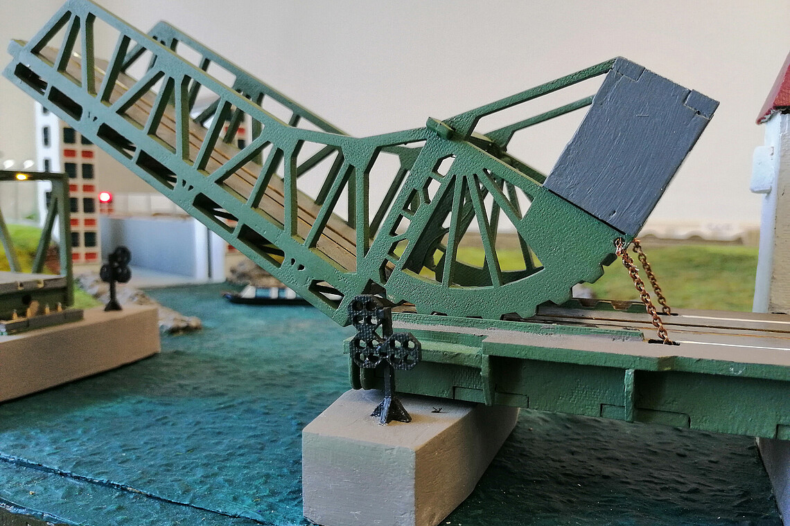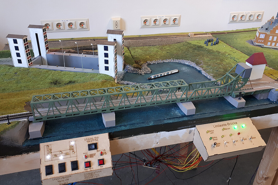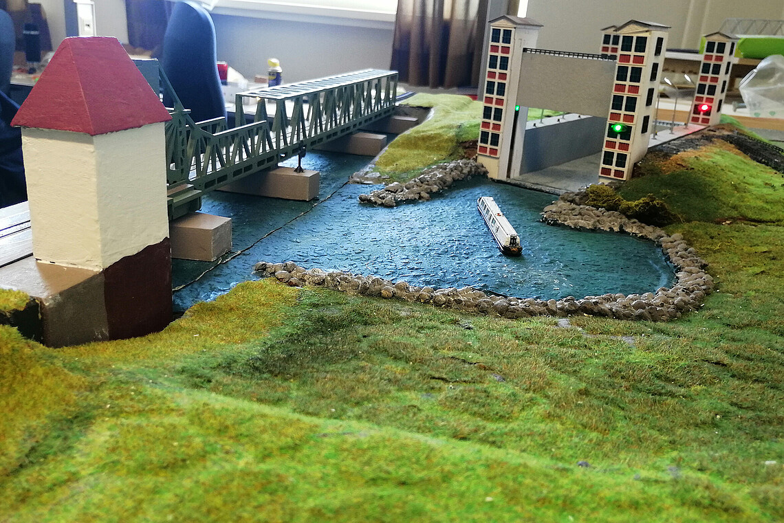 Die damalige Aufgabenstellung war eine Klappbrücke zu konstruieren und umzusetzen. Die echte Lindaunisbrücke steht in meiner Heimat. Um die Brücke möglichst detailgetreu nachzubauen, habe ich die Brücke besucht und so viele aussagekräftige Fotos wie möglich gemacht. Anschließend haben wir die Brücke in CAD modelliert. Dabei haben wir darauf geachtet, dass alle Teile in dem kleinen Maßstab umgesetzt werden konnten. Anschließend haben wir die Einzelteile aus sogenanntem Kraftplex, einem Holzmaterial, mit einem Lasercutter gefertigt. Außerdem haben wir zusätzliche Bauteile wie die Schienen und den Elektromotor beschafft. Während des Zusammenbaus war insbesondere das Löten der sehr kleinen Einzelteile eine große Herausforderung. Nachdem alles zusammengebaut war, haben wir die Brücke lackiert und in das Gesamtmodell der HAWwer Rail eingepasst.