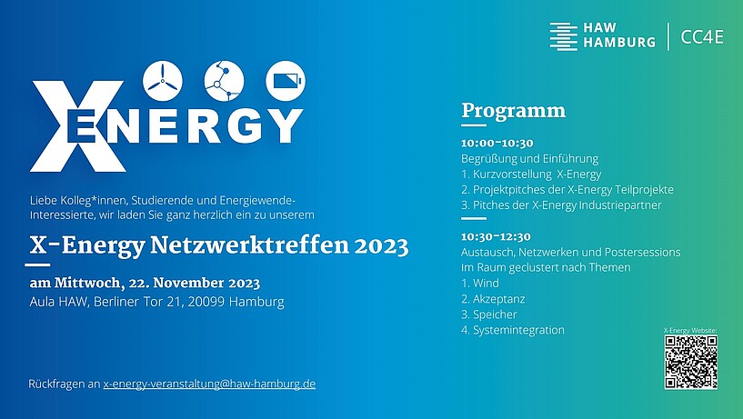 Am Mittwoch, den 22.11.2023 findet das X-Energy-Netzwerktreffen zur Energiewende statt. Von 10:00-12:30 Uhr erwartet Sie in der Aula am Berliner Tor 21 ein interessantes Programm mit einem Querschnitt durch das Spektrum energiewendebezogener Forschung am CC4E der HAW.