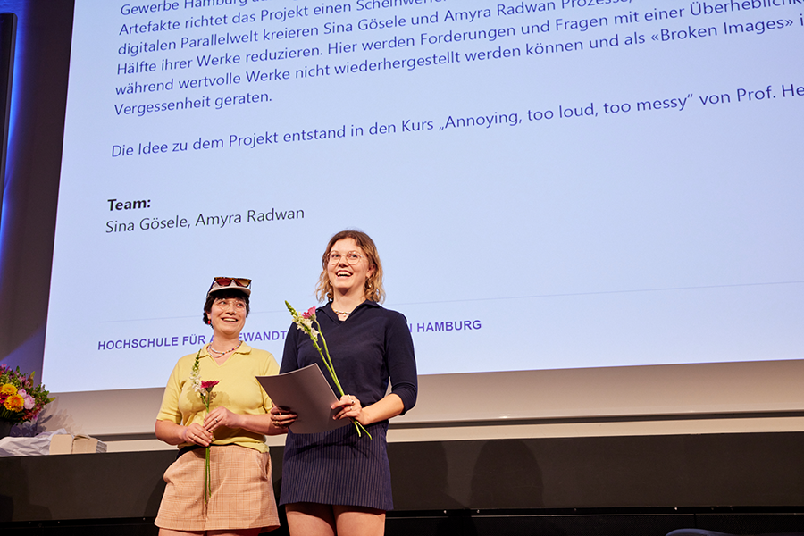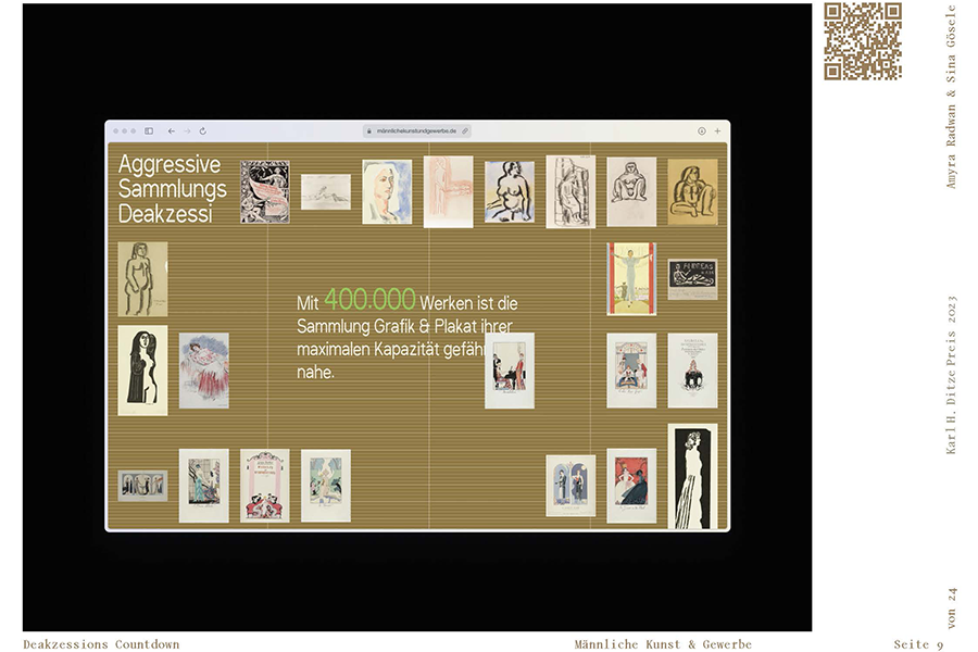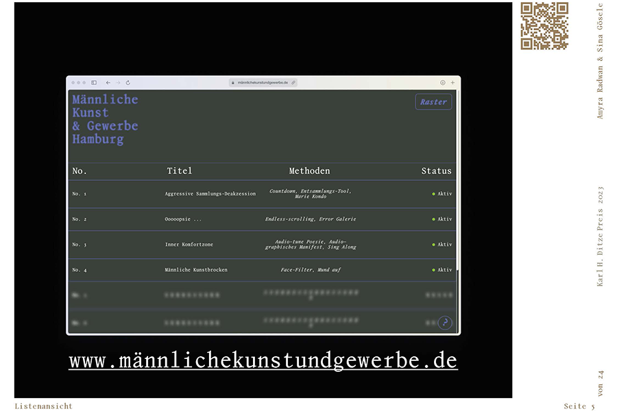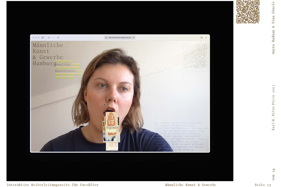 „Männliche Kunst und Gewerbe“ ist eine Protestaktion, die das Ungleichgewicht der Sammlung des Hamburger Museums für Kunst und Gewerbe (MK&G) aufzeigt und anprangert. Mit einer Sammlung spekulativer Websites und aktivistischer, digitaler Artefakte richtet das Projekt einen Scheinwerfer auf die Ecken großer Kunst- und Designinstitutionen. In einer digitalen Parallelwelt kreieren Sina Gösele und Amyra Radwan Prozesse, die ganz unbürokratisch die Sammlung um die Hälfte ihrer Werke reduzieren. Hier werden Forderungen und Fragen mit einer Überheblichkeit à la Mike Meiré gestellt, während wertvolle Werke nicht wiederhergestellt werden können und als «Broken Images» in einem unendlichen Scroll in Vergessenheit geraten. Die Idee zu dem Projekt entstand in den Kurs „Annoying, too loud, too messy“ von Prof. Heike Grebin und Lea Sievertsen im Studiengang Kommunikationsdesign.