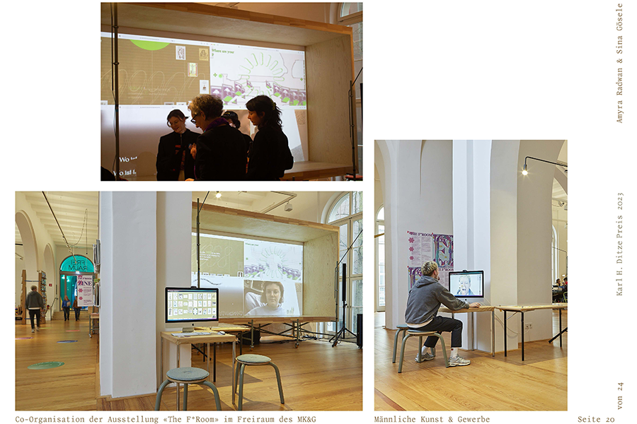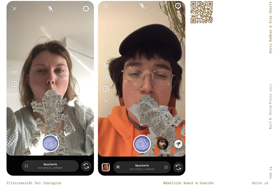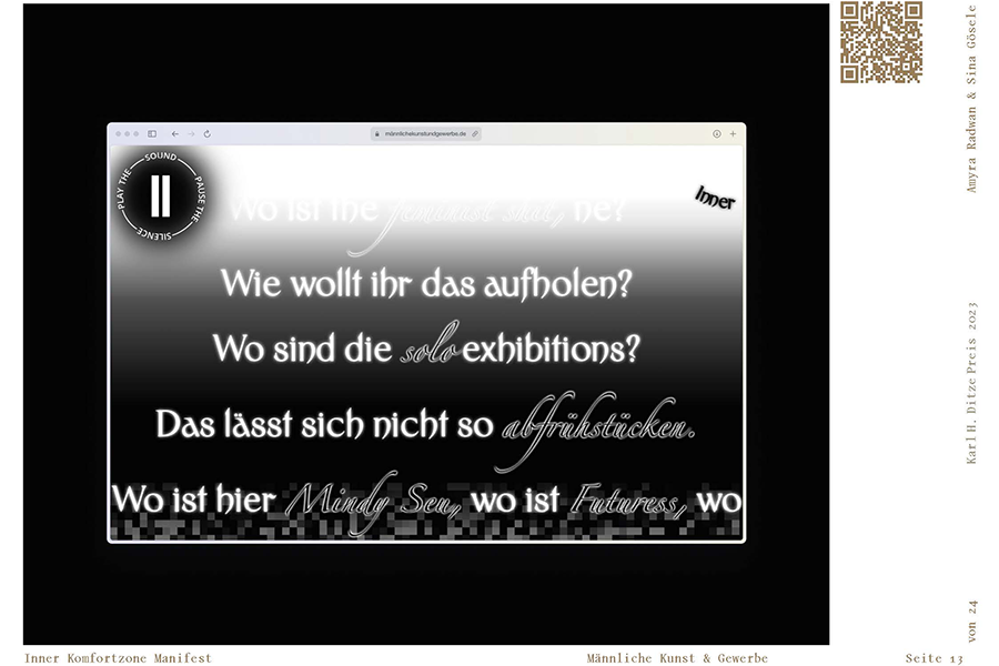 Also ich wünschte mir ja, sagen zu können, dass meine Arbeit und meine Lebensrealität unter dem Stern nichtmännlicher Kunst und Gewerbe stehen. Doch das ist natürlich utopisch, wir sehen überall ein Abbild der Gesamtgesellschaft. Woran ich bei dem Projekt „Männliche Kunst und Gewerbe“ von Amyra Radwan und Sina Gösele sofort denken muss, ist das berühmte Zitat von Ulay: „Ästhetik ohne Ethik ist Kosmetik“.Und gerade weil die Arbeit eine ausgewiesene Protestaktion ist, spricht mir das Projekt aus dem Herzen. Die Umsetzung ist kreativ und satirisch und digital unheimlich clever gelöst. Dieses – rein rechnerisch – nicht wieder aufholbare Ungleichgewicht von Ownership in der Welt der Künste ist etwas, wofür es sich zu kämpfen lohnt. So laut und ausdauernd wie möglich. Das haben die beiden Designer*innen perfekt erkannt. Ich finde ihre Arbeit höchst relevant und gleichzeitig zeitlos – wirklich genial!