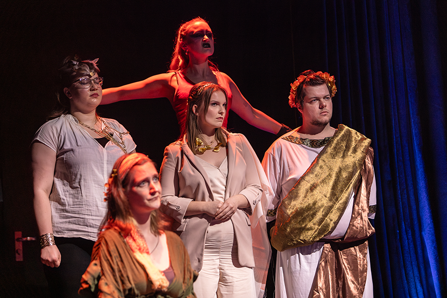 Dieses Team entschied sich nach einem Dramaturgie Kurs mit dem Thema griechische Mythologie, noch weiter und tiefer in das Thema einzusteigen. Ausgehend von dem Text einer Kommilitonin entwickelten die Studierende aus der Medientechnik kurzerhand ein eigenes Theaterstück und brachten es zur Aufführung. Die Szenerie: Die zwölf Götter des Olymps plus Persephone als Vertreterin des Hades sind geladen, das „Menschenproblem” zu diskutieren. Kriege, Umweltkatastrophen, Sittenlosigkeit: Die Menschheit ist dabei, sich selbst zu vernichten. Ob das nun ein Problem ist oder nicht, und wo die Verantwortung und Schuld der göttlichen Vorbilder liegen, sorgt für hitzige Diskussionen. Sogar die Menschen sind vor einer Abstimmung über das Vorgehen nicht in Sicherheit.