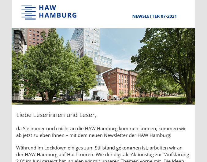 Der interne Newsletter der HAW Hamburg bietet Ihnen alle zwei Monate einen Mix an Themen, die speziell Informationsbedarfe der Mitarbeitenden aus Lehre, Forschung und Verwaltung in den Fokus rücken. Wir stellen Neuigkeiten und Aktuelles aus den verschiedenen Organisationseinheiten und Fakultäten vor, greifen Themen des Präsidiums auf, vermitteln Tipps & Tricks rund um den Arbeitsalltag im Bereich Lehre und Verwaltung an der HAW Hamburg und informieren über anstehende Termine.