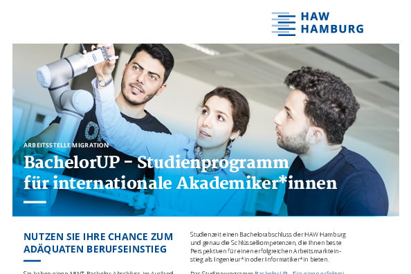 Das modulare Studienprogramm BachelorUP der HAW Hamburg gibt Ihnen den hochschulischen Rahmen für die best- und schnellstmögliche Transformation Ihrer mitgebrachten akademischen und berufsrelevanten Kompetenzen und verschafft Ihnen damit einen bildungsadäquaten Zugang zum deutschen Arbeitsmarkt.