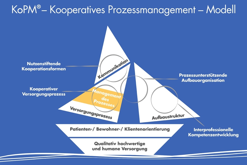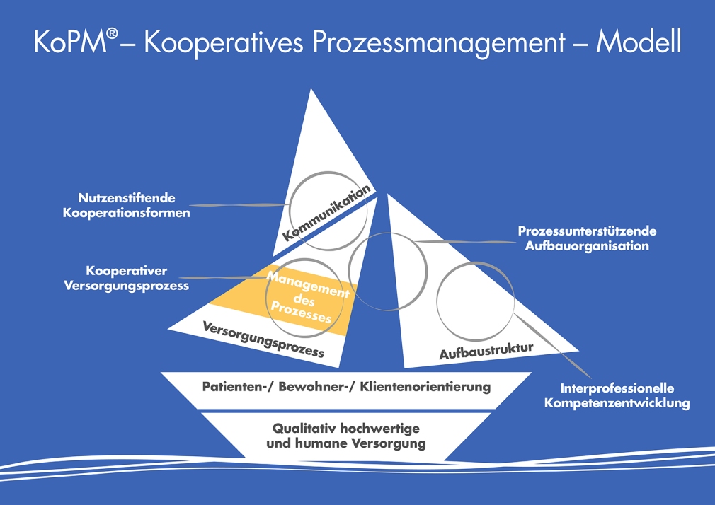 Die medizinisch-pflegerische bzw. therapeutische Versorgung wird auf der Grundlage der Patient*innen- bzw. Klient*innenbedürfnisse und ärztlicher Entscheidung gemeinsam zwischen den beteiligten Berufsgruppen abgestimmt, geplant und durchgeführt. Das KoPM®-Modell konkretisiert diese Form einer guten Zusammenarbeit in Bezug auf die Prozessgestaltung: