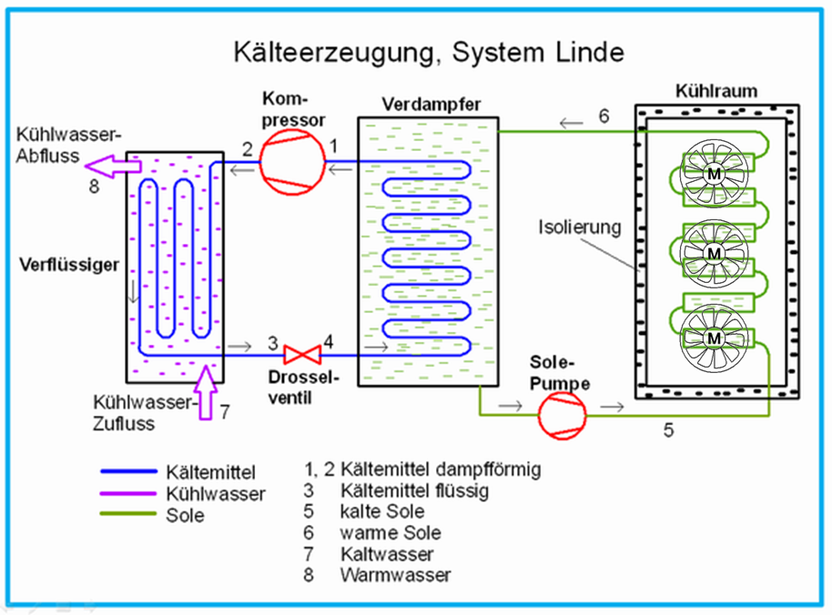 In der Kältetechnik werden üblicherweise Kompressionskälteanlagen verwendet. Die Wärme wird mit Hilfe eines Wärmeübertragers dem Kühlraum entzogen. Das erwärmte Kältemittel wird dann mit Hilfe eines Kompressors auf einen höheren Druck verdichtet. Dadurch wird auch die Temperatur des Kältemittels erhöht. Der Kompressor benötigt elektrische Energie. Die Wärme wird dann mit der höheren Temperatur an die Umgebung abgegeben. Das Kältemittel wird mit einer Drossel entspannt. Die Funktionsweise einer Kälteanlage entspricht der Funktionsweise einer Wärmepumpe.