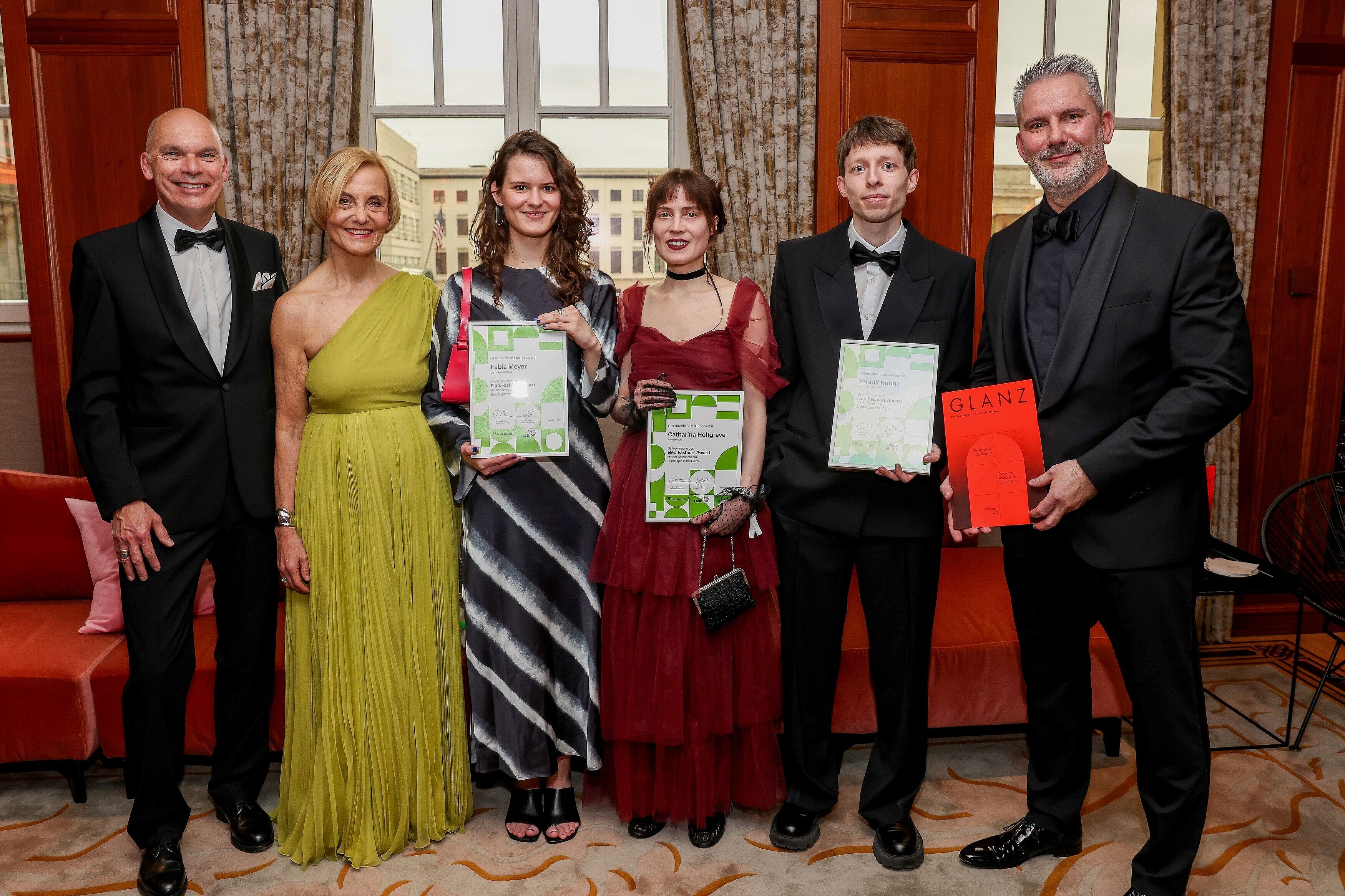 Auch in diesem Jahr hat der Gesamtverband textil+mode auf dem Bundespresseball gezeigt, dass es ausgezeichnete Talente in der Textil- und Modebranche gibt. Zusammen mit der Neo.Fashion. zeichnete der Verband Design-Newcomer aus. Mit Catharina Holtgrave (Alumna HAW Hamburg), Yannik Knorn (Hochschule Hannover) und Fabia Meyer (Hochschule Bielefeld) ehrte der Gesamtverband textil+mode die drei Gewinnerinnen und Gewinner des Neo.Fashion Award.
