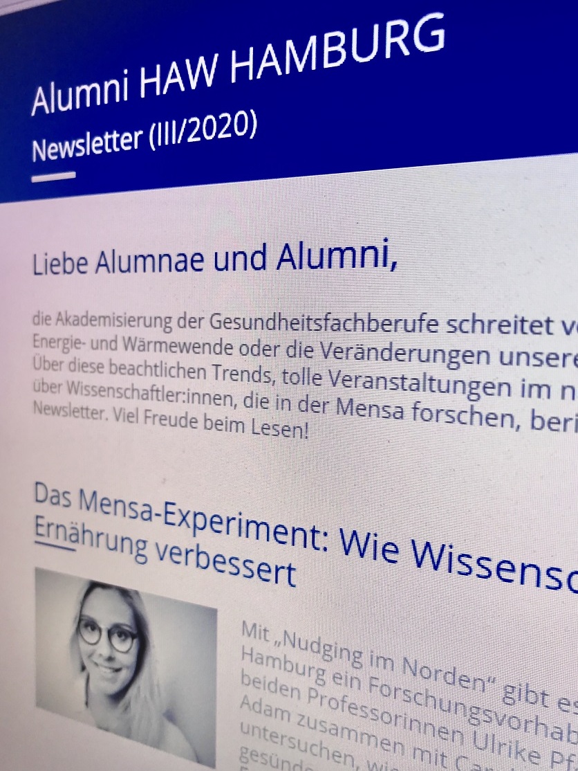 Wir versenden regelmäßig viermal pro Jahr den Alumni-Newsletter der HAW Hamburg mit Informationen rund um die HAW Hamburg, ihre Fakultäten und Departments, aber auch von unseren Alumni/ae. Sollten Sie eigenene Anliegen oder Impulse haben, kontaktieren Sie uns gern!
